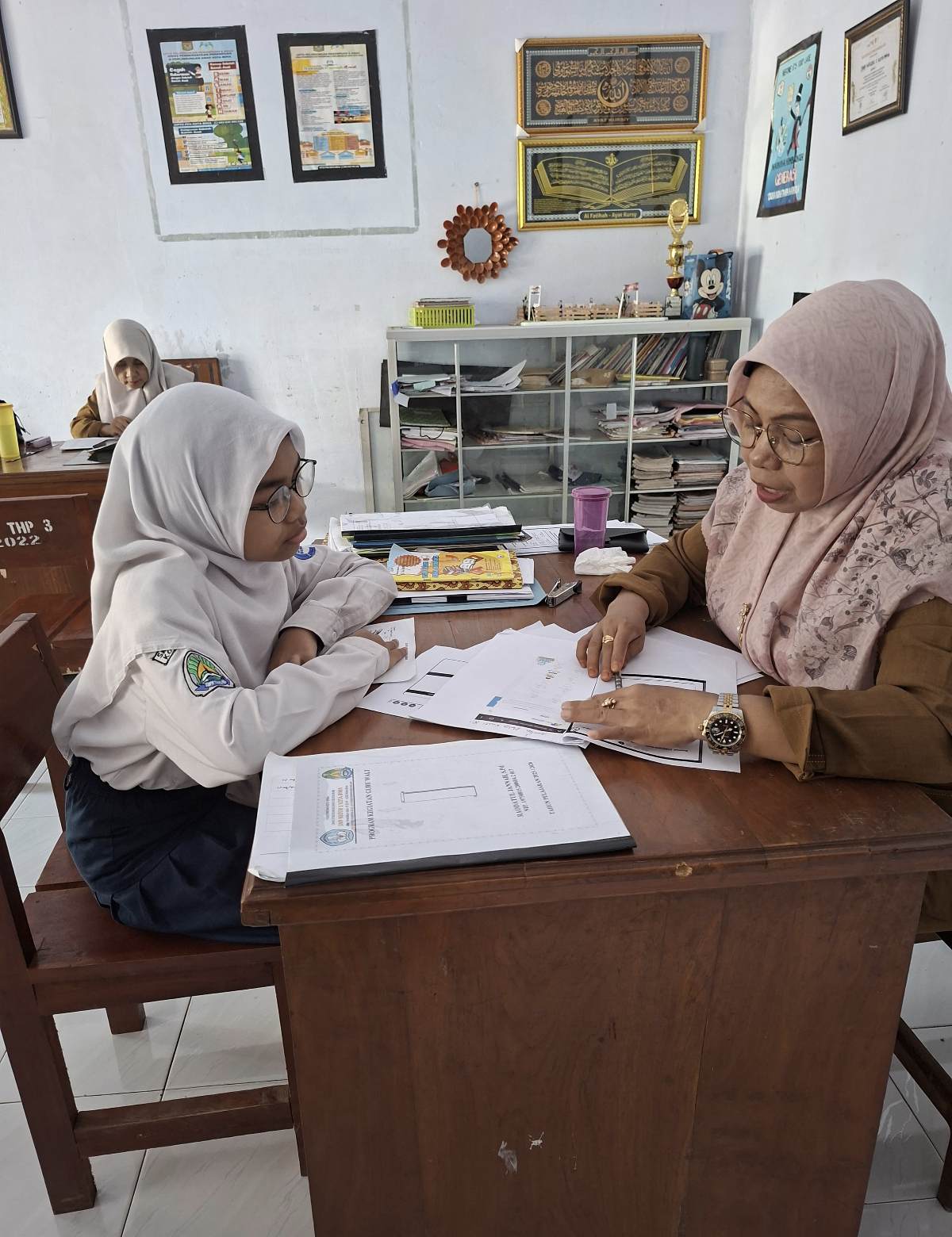 Murid yang mengenakan seragam sekolah dengan hijab putih tersebut tampak serius mendiskusikan lembar-lembar data dan informasi di hadapannya bersama guru BK. Diskusi ini tidak sekadar menjawab pertanyaan, tetapi merupakan proses penting dalam mengenali potensi, minat, dan bakat unik yang dimiliki murid.