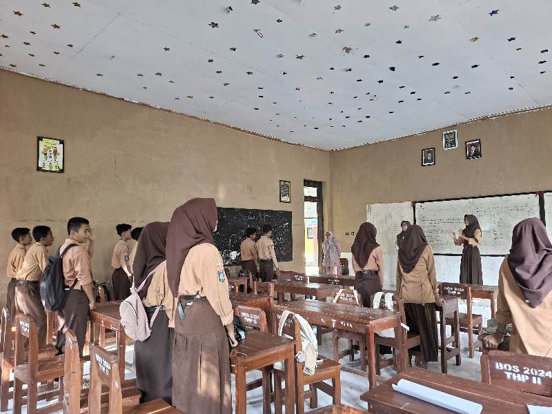 Mengawali sesi belajar, para siswa tidak langsung memulai dengan materi pelajaran. Seperti tampak dalam kegiatan tersebut, seorang guru berhijab cokelat memimpin jalannya kegiatan dengan gestur ramah dan terbuka. Para siswa berdiri rapi di samping bangku kayu mereka yang sederhana, mengikuti arahan untuk berdoa bersama dan menyanyikan lagu kebangsaan sebelum pelajaran dimulai.