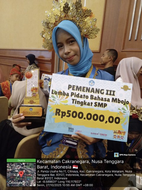 Duta SMPN 1 KOBI mata lomba pidato mbojo Nasila Wardah meraih juara 3 Tingkat Propinsi NTB