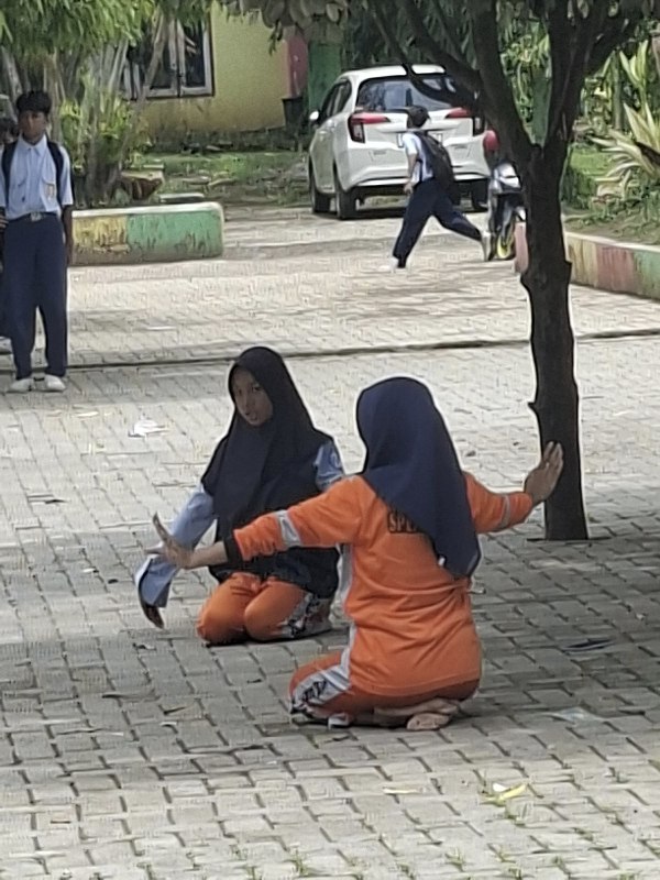 Di area sekolah yang rindang dengan pohon-pohon dan dikelilingi paving block, mereka mengulang berbagai formasi. Ada gerakan yang dilakukan sambil berlutut dan mengayunkan tangan secara serentak, menampilkan harmonisasi yang indah. Seorang siswi berbaju oranye tampak berdiri memimpin atau melakukan gerakan solo yang dinamis, menunjukkan ketangkasan dan kelenturan tubuhnya.